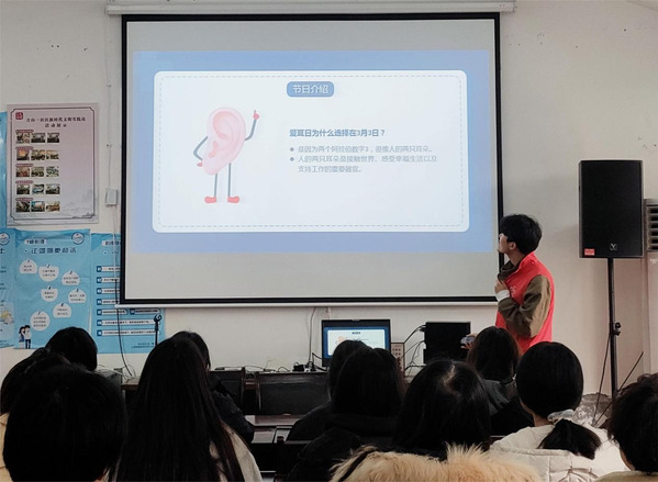 与此同时,学院志愿者们在吉山社区开展了以“关爱听力,聆听精彩”为主题的爱耳护耳、听力康复知识宣讲。通过发放宣传单、播放PPT等多种形式,志愿者们向居民讲解有关耳朵的结构、功能、听力保健的知识,引导社区居民学习听力健康知识,养成科学用耳行为,主动预防噪声污染、耳毒性药物等有害因素对听力造成伤害,并叮嘱居民们定期进行听力健康检查,树立耳聋防治理念和信心,增强主动健康意识。