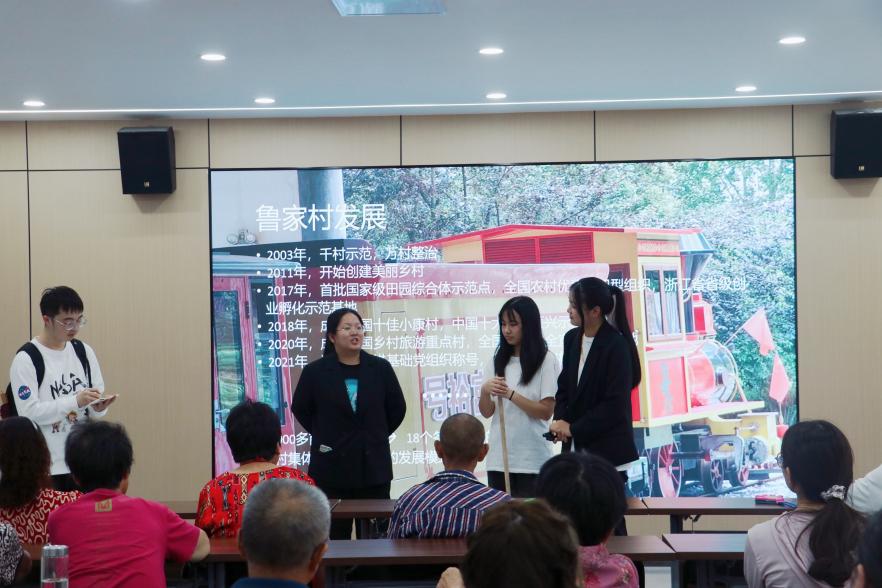 “在‘两山’理念指引下,安吉鲁家村从一个“没有垃圾箱,河道又黑又臭”的落后村变为“开门就是花园,全村都是景区”的创富明星村。”这是实践团在香樟湾社区活动室开展的“乡村振兴,鲁家村新时代‘山乡巨变’”的主题宣讲,讲述安吉鲁家村的绿色发展之路。