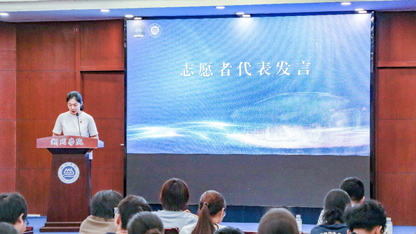 校团委负责人致辞,她强调优质的志愿服务是比赛顺利进行的重要环节,也是展现湖院学子能力素质的重要窗口,希望全体志愿者胸怀强烈的责任感,保持积极的工作状态,树立严格的纪律意识,注意个人人身安全,全力以赴完成工作。
