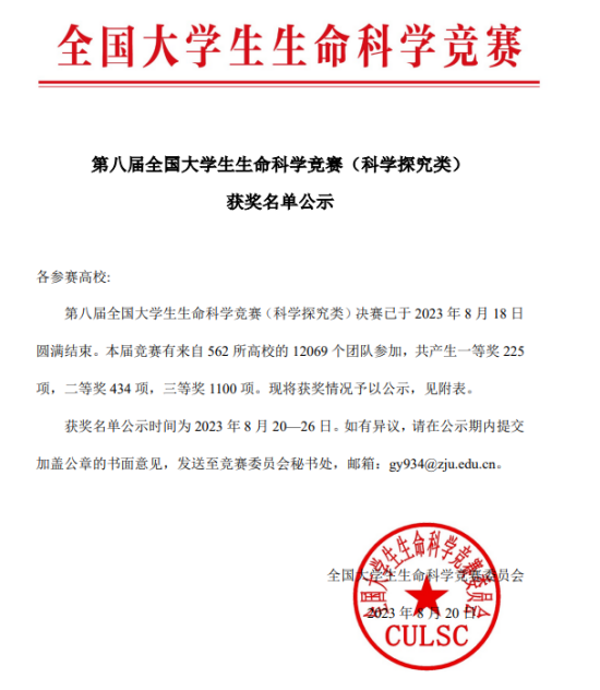 8月20日,第八届全国大学生生命科学竞赛(科学探究类)获奖名单公示,本届竞赛有来自 562 所高校的 12069 个团队参加,共产生一等奖 225 项,二等奖 434 项,三等奖 1100 项。生命健康学院刘骕骦博士、刘燕敏博士共同指导,林紫依、徐乐、李天龙、谭清蔚、何宏泰五位同学共同参与的项目《大豆GmPM31启动子参与高温高湿胁迫响应的功能分析》荣获全国三等奖,也是我校学子在该赛道首次获奖。